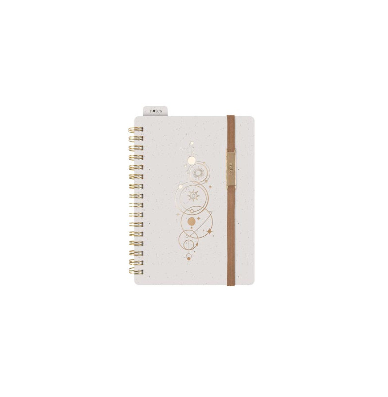 záznamy na cestách nebo každodenní použití. Obálka v jemné krémové barvě je zdobena zlatým motivem vesmírných symbolů,