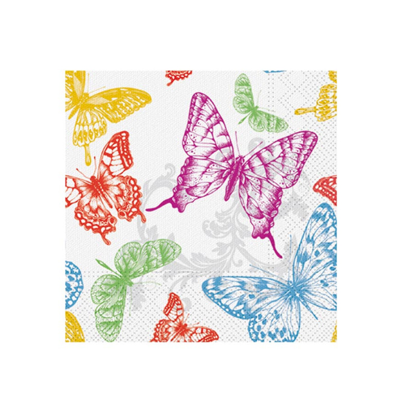 Veselý motiv pestrobarevných motýlů na ubrousku vnese na váš stůl radost a lehkost. Skvěle se hodí nejen na jarní nebo