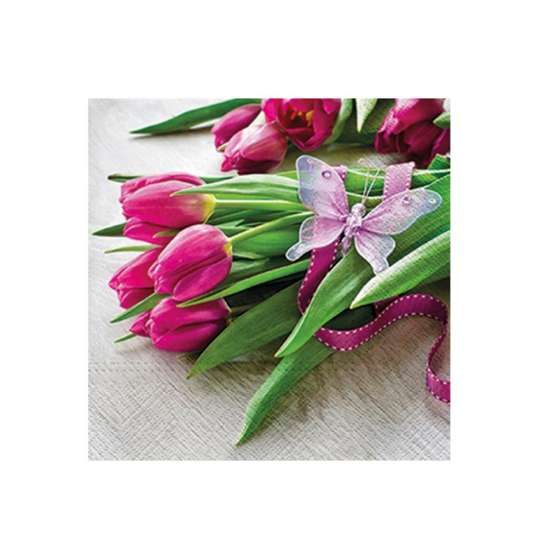 Dodejte stolování šmrnc a jemnou eleganci. Papírový ubrousek s motivem růžových tulipánů, mašle a ozdobného motýla