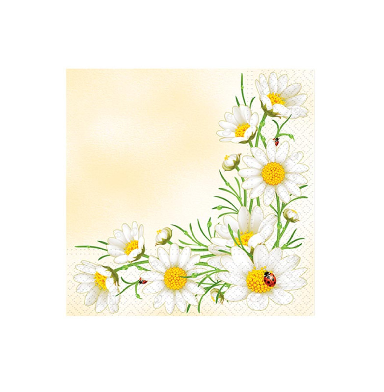 Rozkvetlé kopretiny se zářivě žlutými středy a hravé berušky přinesou na váš stůl radost i lehkost letního dne. Jemný