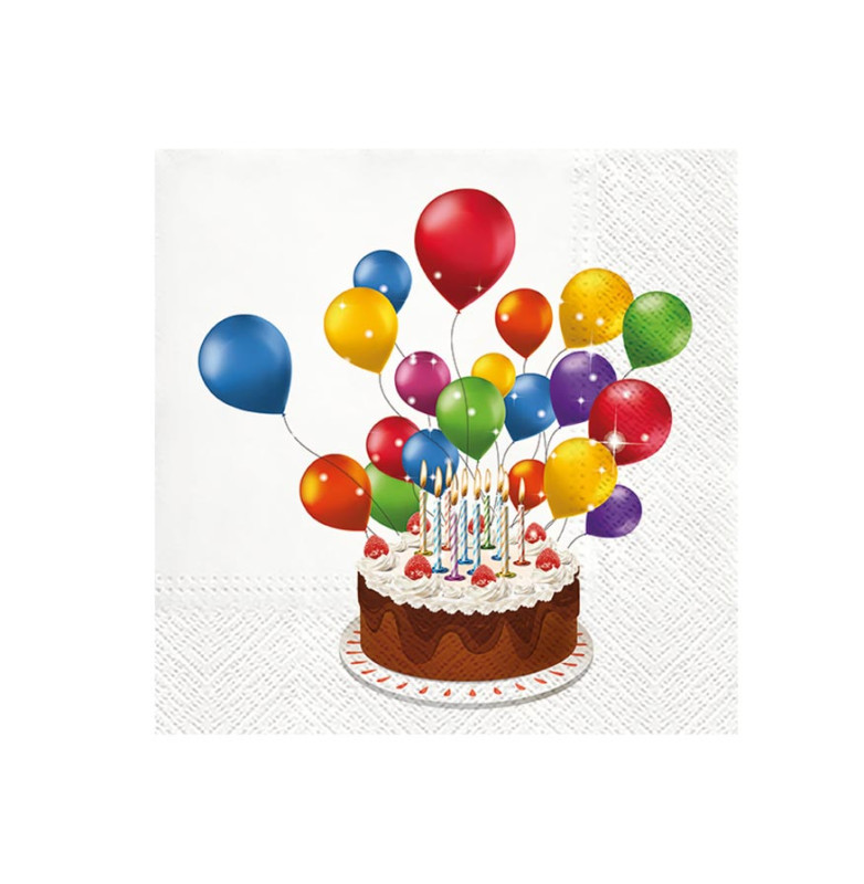 Oslava bez balónků a dortu? Nemožné! Tento ubrousek vám přinese oboje najednou – zářící dort se svíčkami a pestrou
