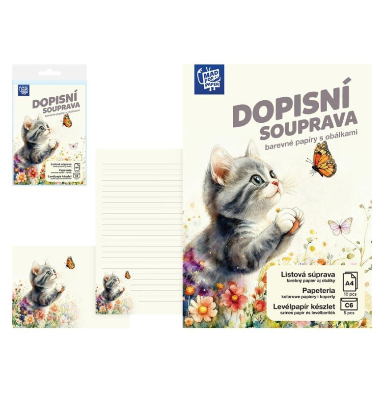 Barevná dopisní souprava LUX s motivem koťátka přináší jemný a hravý design. Listy dopisního papíru formátu A4 jsou