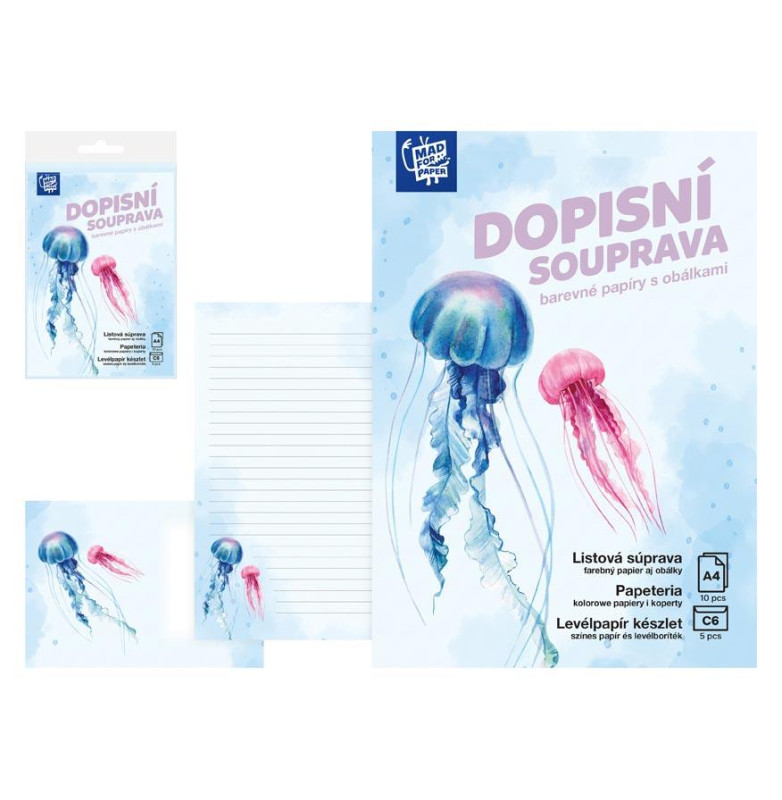 Dopisní sadu tvoří linkované listy formátu A4 doplněné potištěnými obálkami C6. Motiv barevných medúz zdobí jak