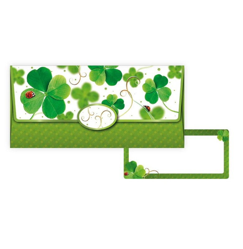 Darujte peníze s úsměvem a radostí! Obálka je laděná do svěžích zelených tónů, zdobená čtyřlístky a beruškami –