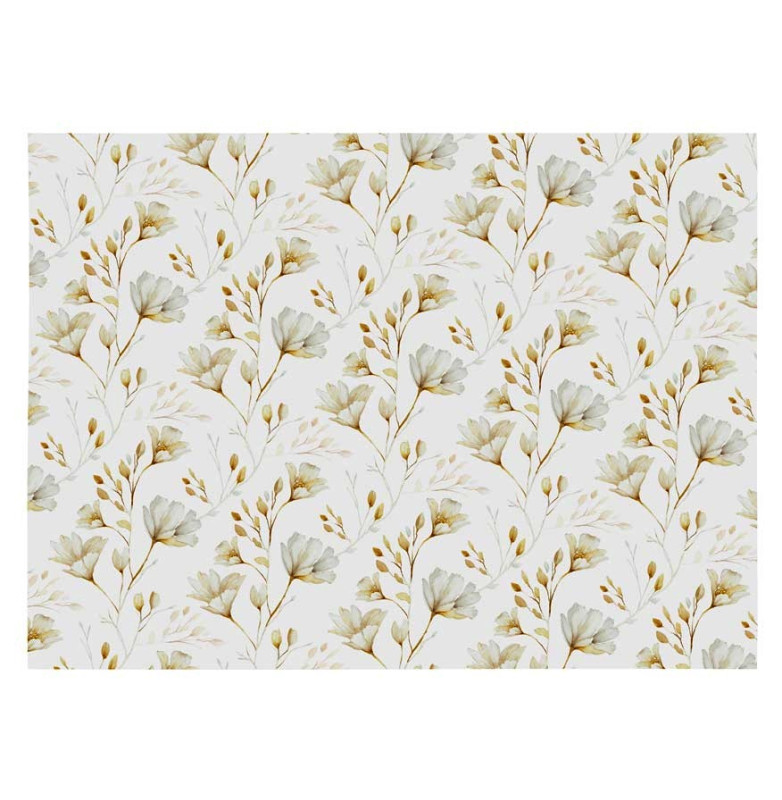 Jemné bílé květy se zlatavými akcenty vytvářejí dojem čistoty a svěžesti. Papír má pevnou strukturu, která se při