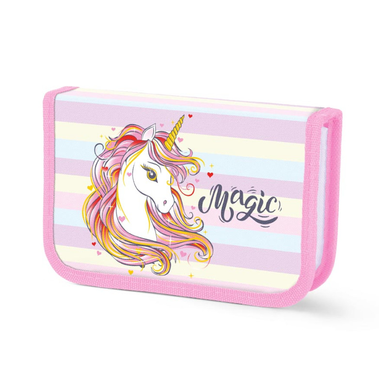 Školní jednopatrové pouzdro se dvěma chlopněmi s obrázkem jednorožce. Penál je nezbytná součást výbavy každého školáka!