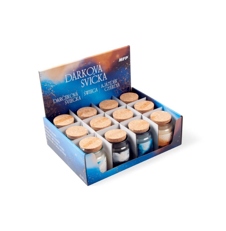 svíčku, pečlivě vybranou tak, aby vystihovala jeho jedinečnou energii. Skleněná dóza s přírodním korkovým víčkem chrání