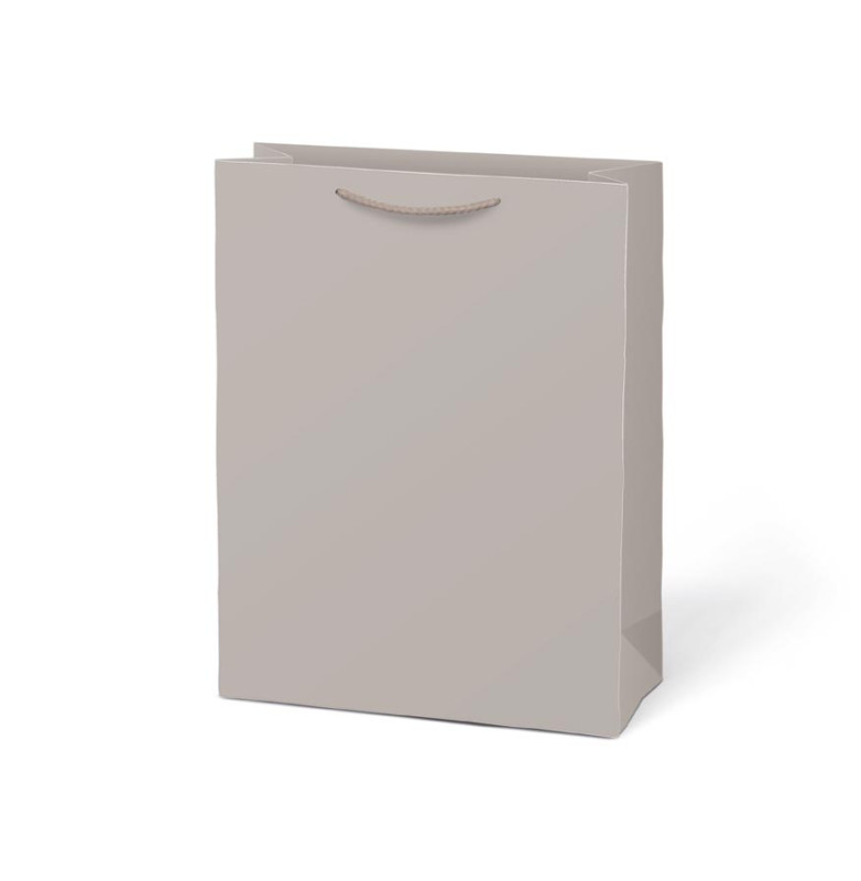 Dárková taška T5 z pevného kraftového papíru v jemném šedém odstínu. Provázková ucha s barvou tašky přirozeně ladí a