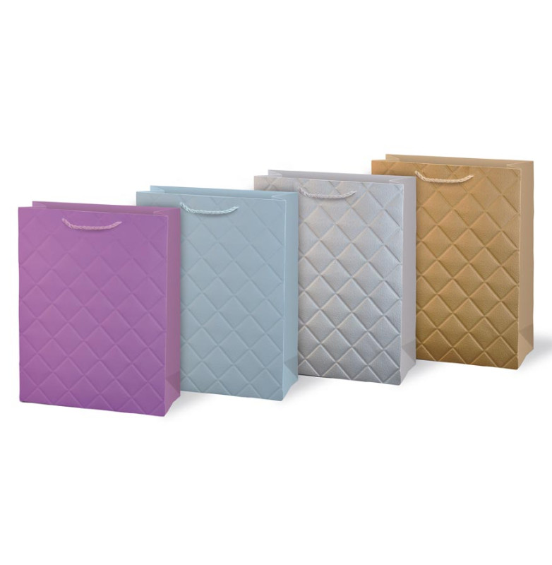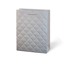papíru. Povrch tašky má jemný reliéfní vzor ve tvaru kosočtverců, který působí decentně a dodává dárku reprezentativní