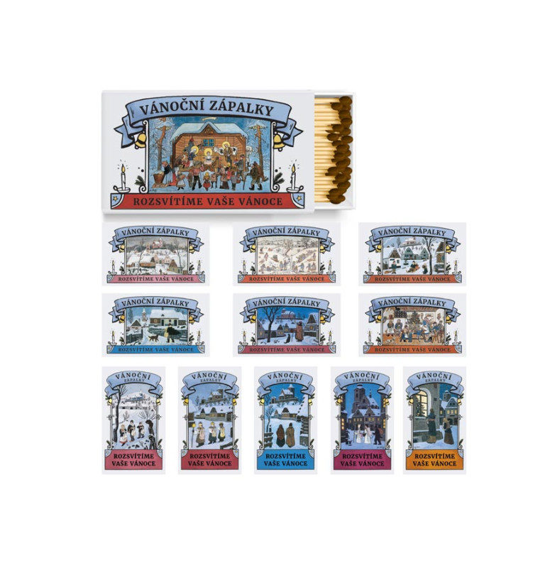 Dlouhé zápalky s ilustracemi Josefa Lady propojují užitečnost s atmosférou tradičních českých Vánoc. Krabičky zdobí