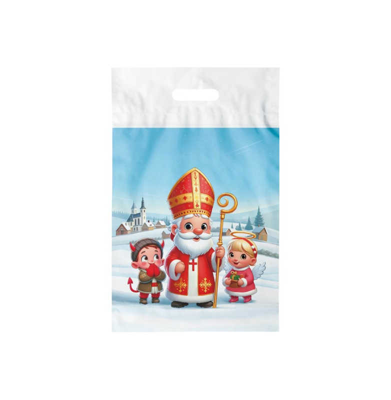 Igelitová taška s průhmatem a barevným mikulášským motivem. Je ideální pro různé typy dárků, od malých sladkostí a
