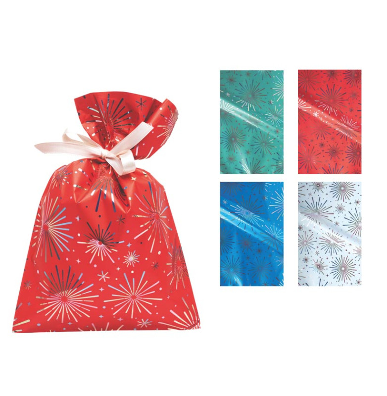Vánoční dárkový sáček Iride září jako zimní obloha plná ohňostrojů a hvězd. Elegantní lesklý potisk s motivem