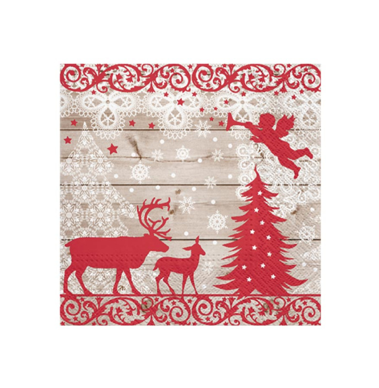 sob se srnkou, červený vánoční strom a anděl s trumpetou. Jemné krajkové vzory na dřevěném podkladu dodávají ubrousku