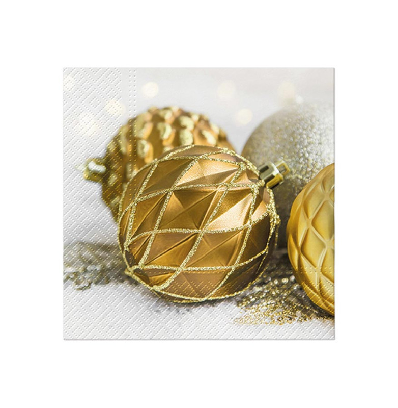 Tento vánoční ubrousek se zlatými ozdobami dodá vašemu stolování slavnostní vzhled a nádech elegance. Motiv zlatých