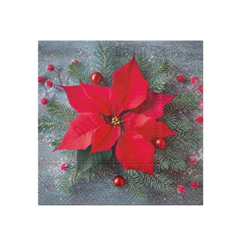 Výrazný červený květ vánoční hvězdy na ubrousku okamžitě upoutá pozornost a stane se dominantou sváteční tabule. Zelené