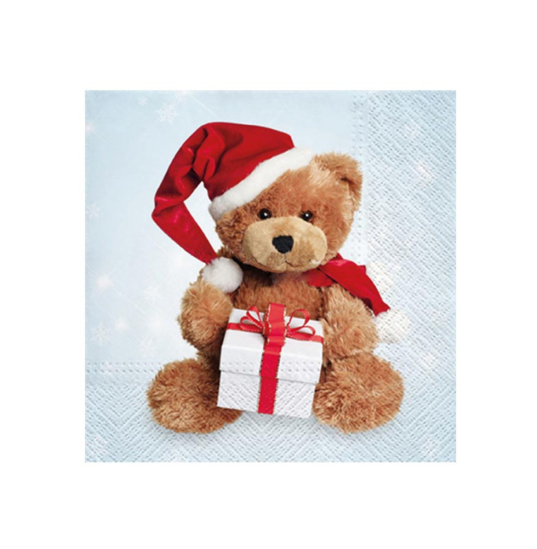 Roztomilý motiv plyšového medvídka v červené čepici a šále s bílým dárkem v rukou vnese na váš stůl hravou a radostnou