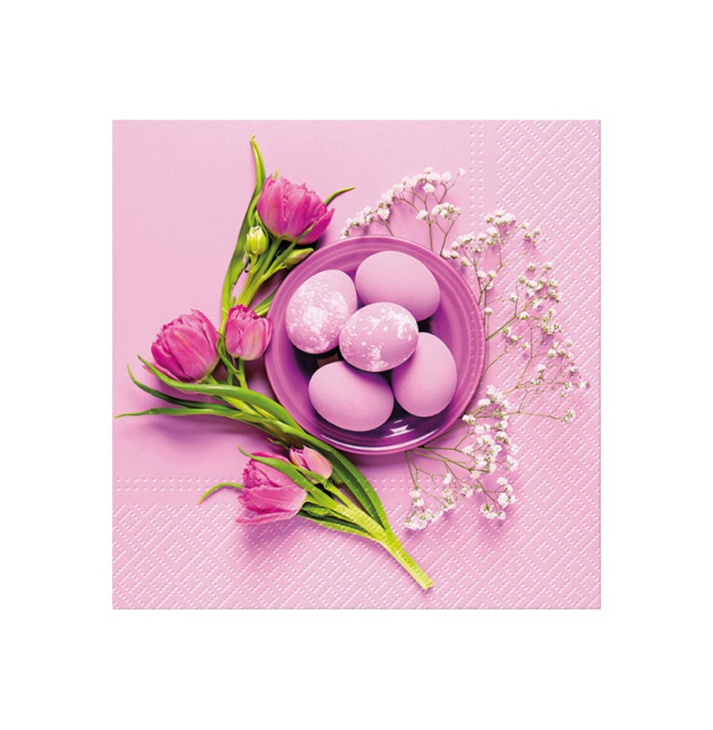 Pastelové barvy a jemné květinové aranžmá velikonočního ubrousku s růžovými vajíčky a tulipány vytvářejí harmonický a