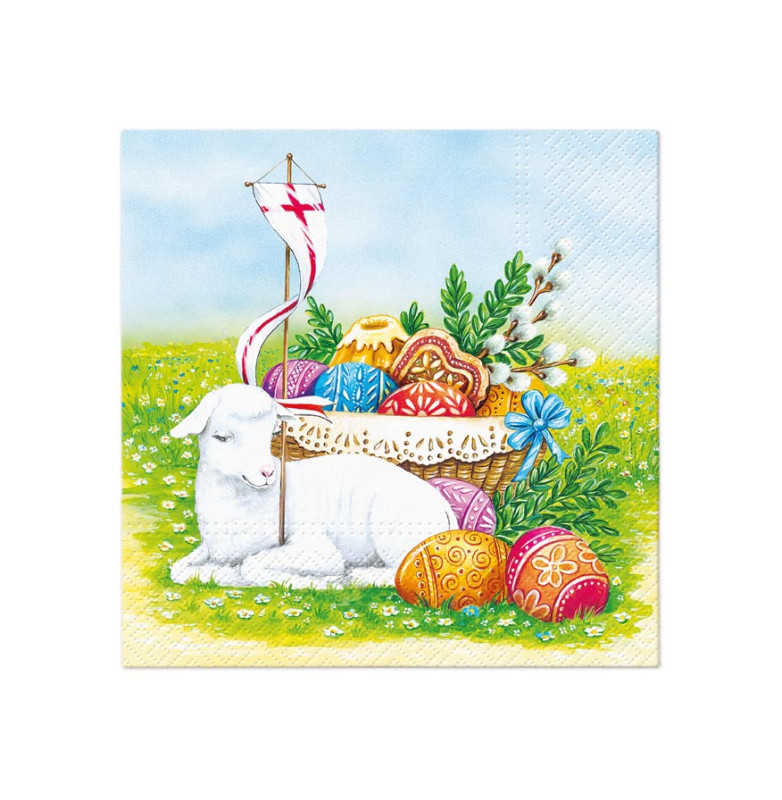 Papírový velikonoční ubrousek. Krásné velikonoční ubrousky s obrázkem beránka a kraslic dodají prostřenému stolu nádech